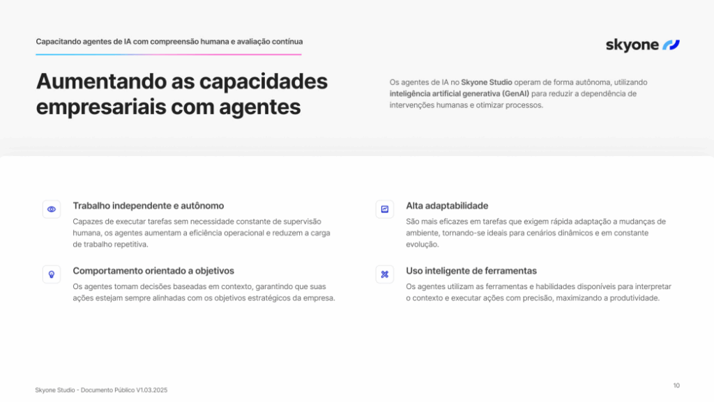 Com uma estrutura robusta e segura, o Skyone Studio ajuda empresas a criar e escalar aplicações com IA generativa, transformando dados em inteligência real e integrada ao dia a dia dos negócios.