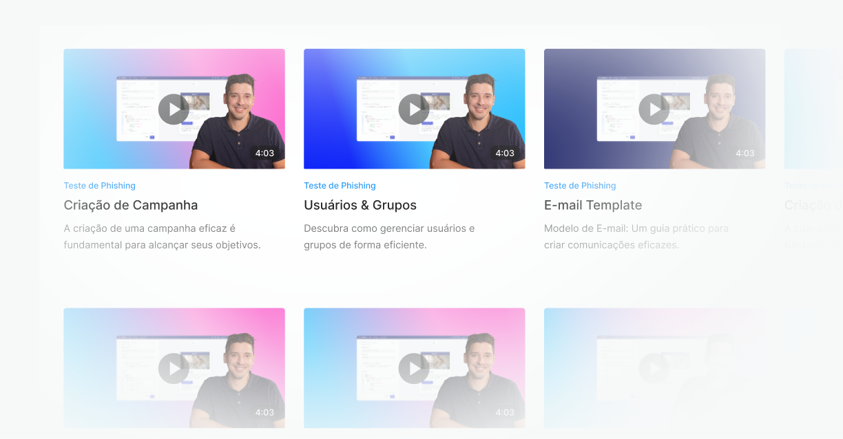 Utilize uma biblioteca de conteúdo educativo em vídeo para abordar os principais temas de segurança da informação. O treinamento é disparado após a falha na simulação, garantindo que o aprendizado ocorra no momento de maior impacto para o usuário.