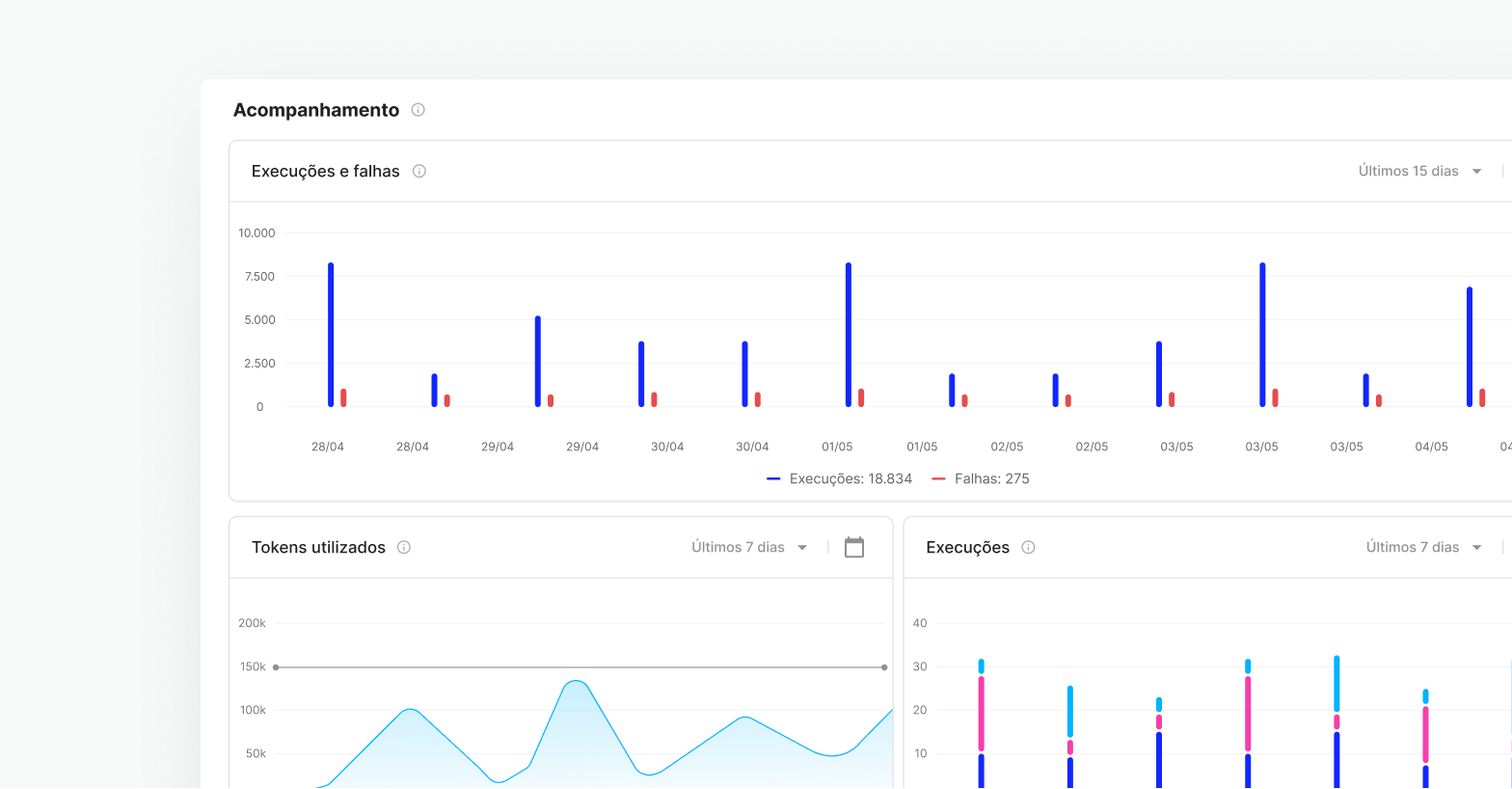 Gerencie e otimize o uso de tokens (unidades de custo e processamento em LLMs), garantindo que o consumo de recursos seja eficiente e alinhado ao seu orçamento.